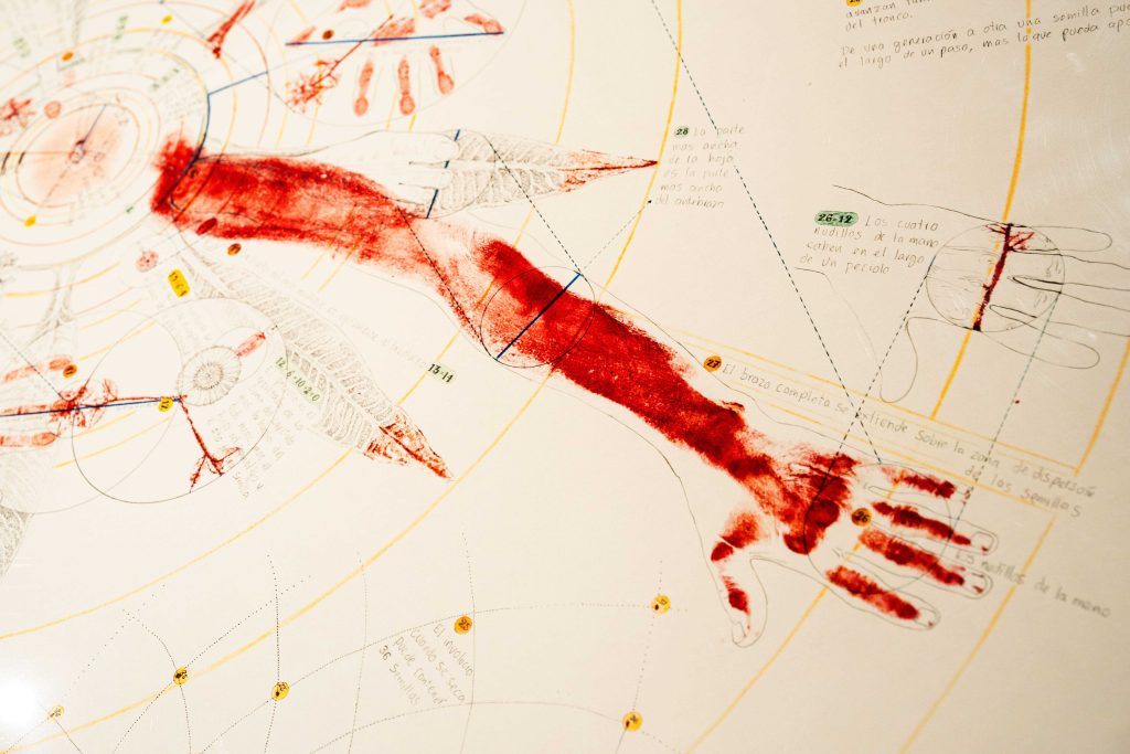 En una dirección, este desplazamiento museográfico permitía experimentar aquello que no se presenta habitualmente en un contexto de arte contemporáneo: materiales orgánicos, tradiciones vivas u orales, o registros de carácter científico o seudocientífico pasaban a formar parte de este ecosistema de significados. En esa línea, por ejemplo, el Museo de la madera del bosque de la Organización Tropenbos Colombia —una red internacional de organizaciones locales que fomentan la conservación de los bosques tropicales y la vida de las comunidades que dependen de ellos— presentaba un archivo de carácter científico donde se conservan y catalogan muestras de distintas maderas nacionales. Gracias a un montaje abierto de sus contenidos este archivo ampliaba su lectura al ir más allá de los datos científicos y realzar aspectos como el ritmo cromático, los olores y las texturas de las muestras de madera. A esta experiencia, que se acercaba por momentos a algo puramente estético, se le sumaba la perturbación que resultaba al identificar muestras de árboles en peligro por la deforestación constante o las alteraciones de su entorno. Asimismo, Relaciones cultivo-animal de Diego Román —una serie de acuarelas vinculadas a observaciones taxonómicas y a conocimientos empíricos locales— dejaba de lado su significado puramente ilustrativo cuando se revelaban la tradición oral y los saberes que aludían a la interdependencia de la fauna local con árboles específicos. Otro trabajo —Caminos de agua, de María Buenaventura en conjunto con el Colectivo Zanjas y Camellones— conectaba aspectos científicos y culturales de un territorio al vincular una arqueología de tradiciones agrícolas ancestrales con la cultura gastronómica del altiplano cundiboyacense en torno al pez capitán, una especie en peligro de desaparecer.